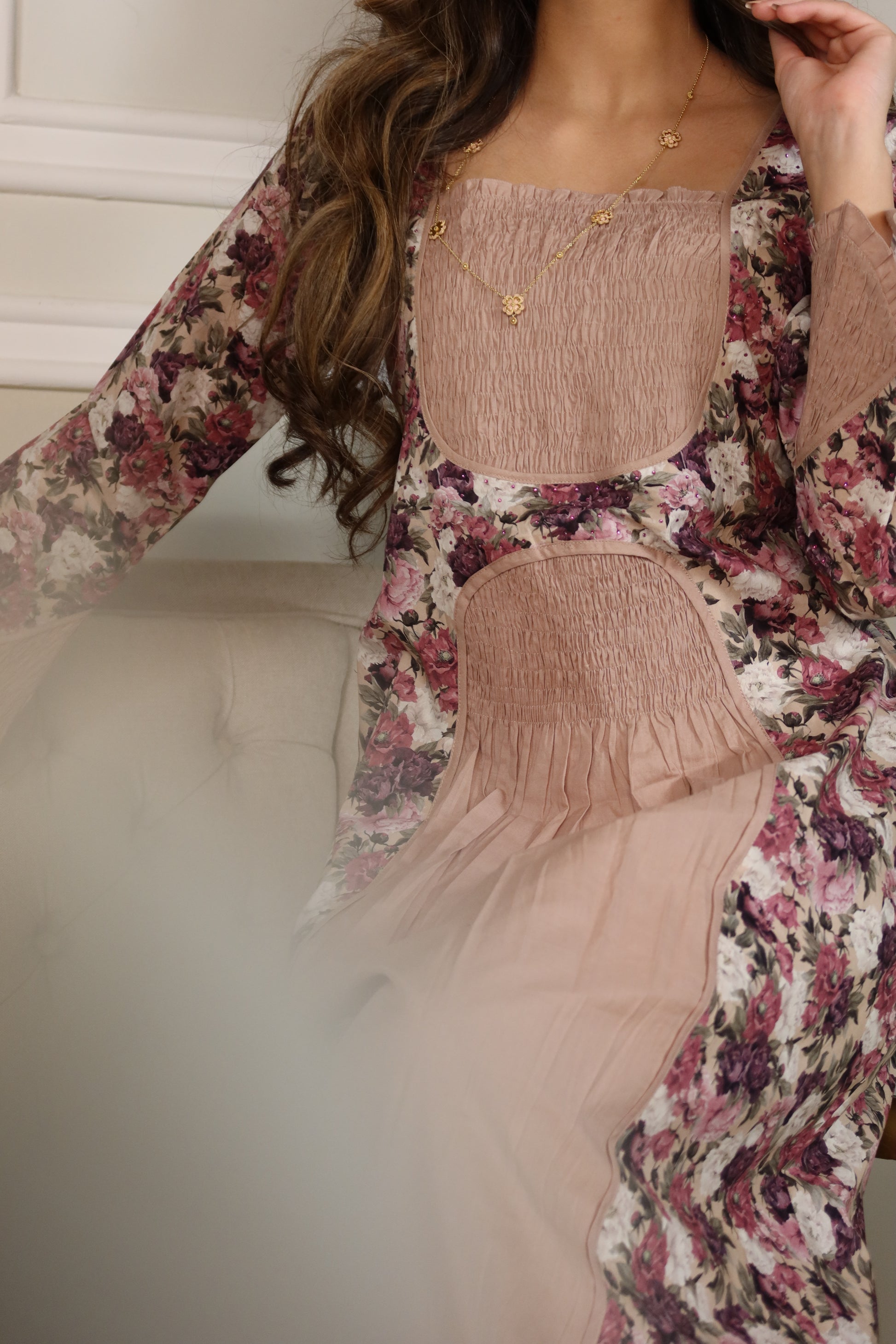 تصميم ناعم بقماش خفيف بطبعة ورود مع دمج تفاصيلsmocked تمنح راحة وانسيابية في اللبس. قصة فضفاضة تليق بكل الأوقات، ومثالية لفترات الراحة أو الحمل بأسلوب أنثوي راقٍ.