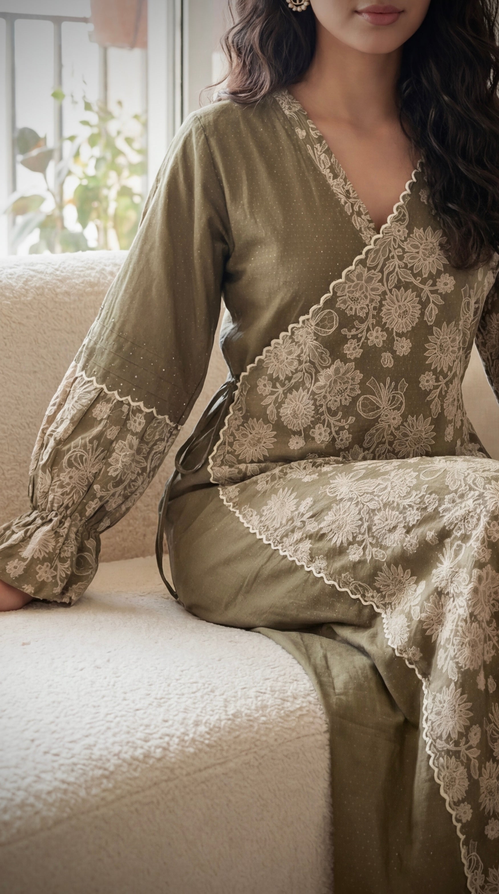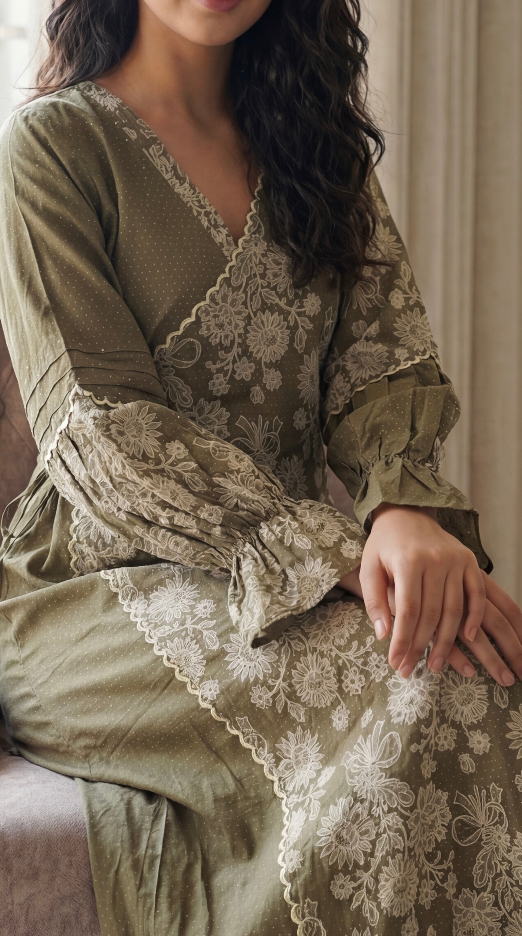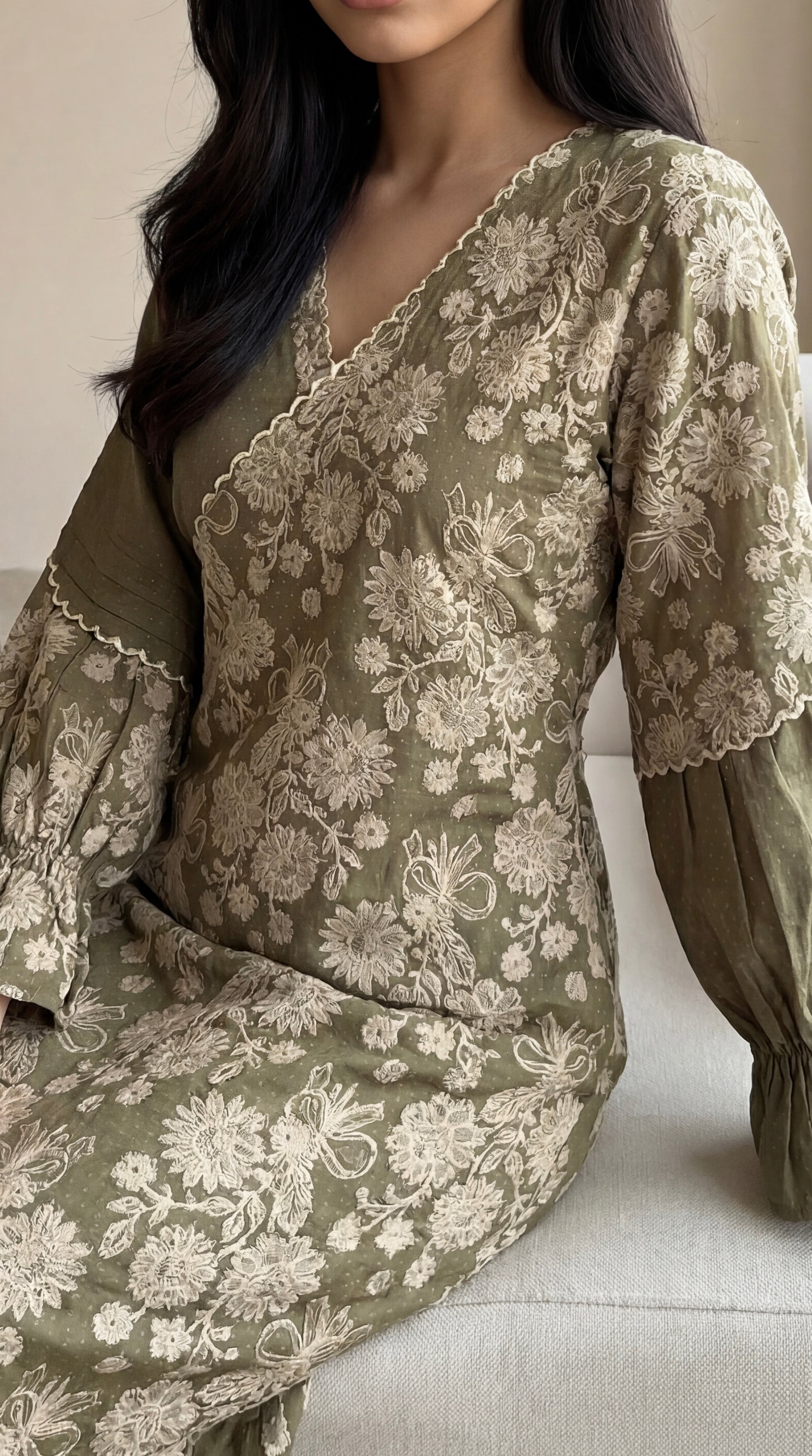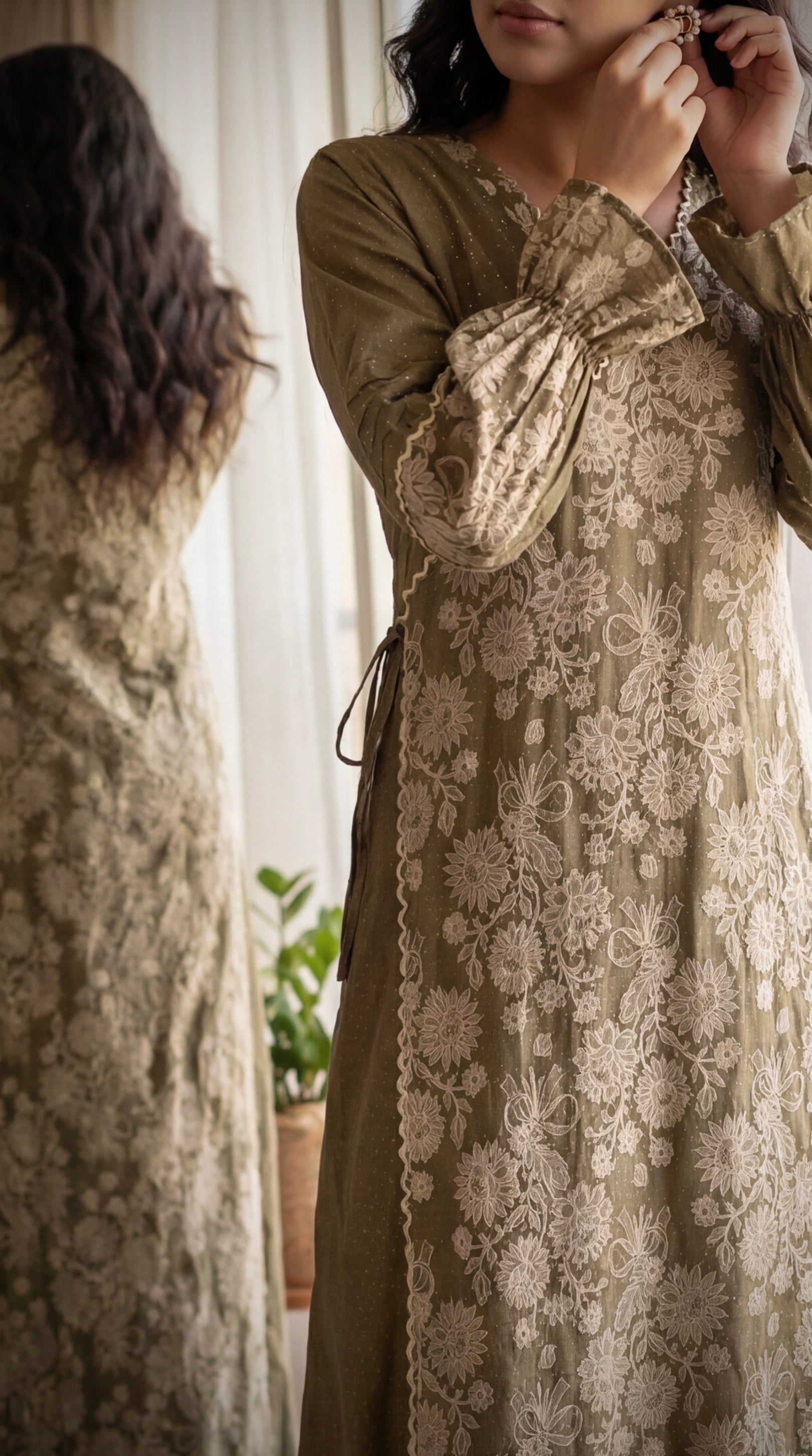 جلابيه دمج تجنن في اللبس.. حواف التطريز والاكمام البف ونثره الفصوص ولمعتها والربطه الجانبيه صنعت منها جلابيه انثويه بامتياز